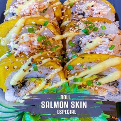 10 Bocados rellenos con piel de salmón crocante, queso crema, aguacate, topping de madurito, pasta de cangrejo, aderezo de la casa y cebollín.