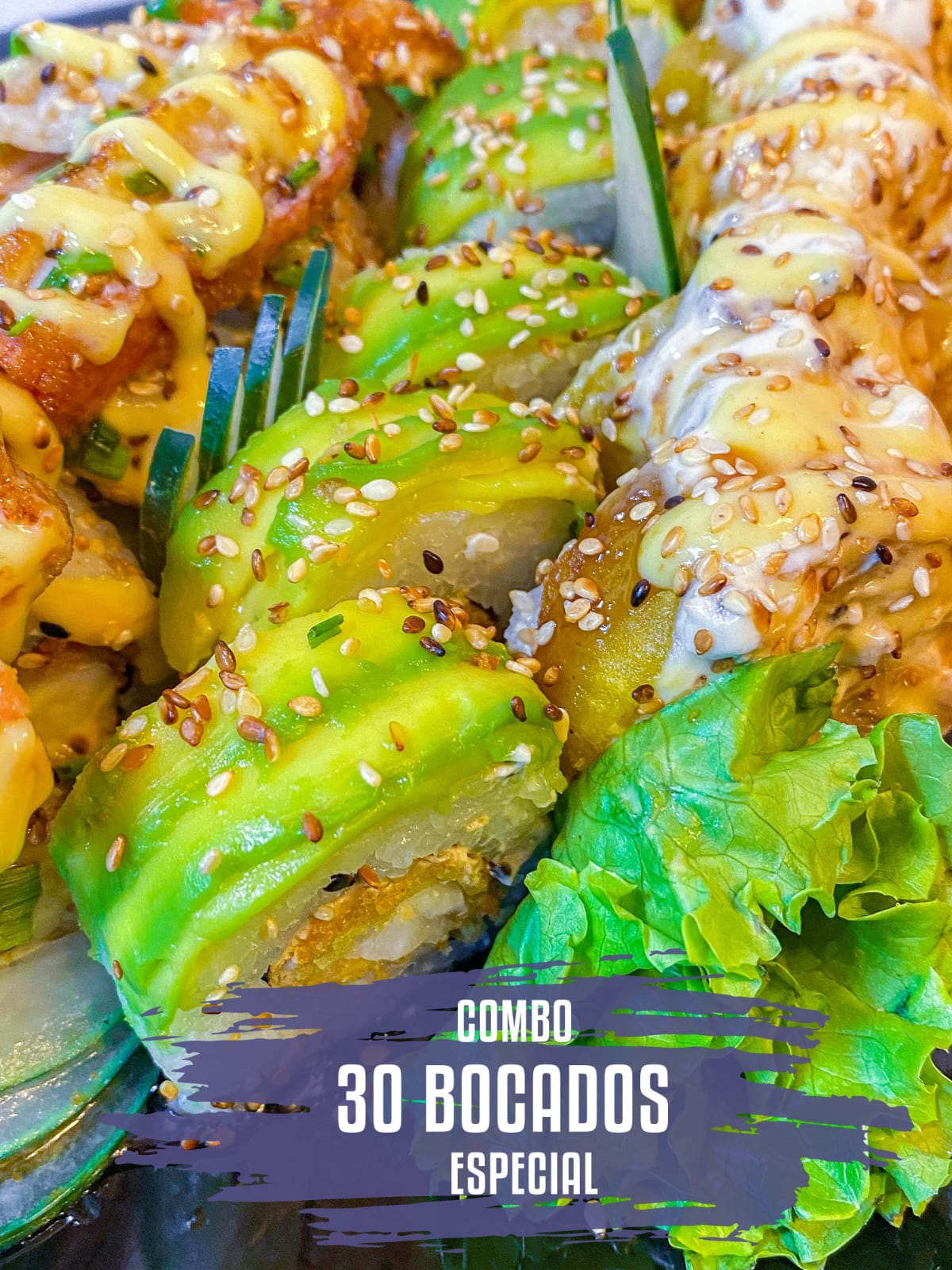 Mixto de 30 especiales: 10 bocados de camarón roll especial, 10 bocados de california tropic special y 10 bocados de izumidai.