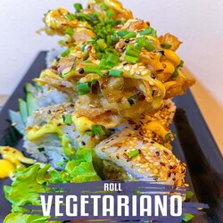 10 Bocados rellenos de vegetales tempurizados, queso crema, aguacate y topping tempura de vegetales con salsa de la casa, ajonjoli tostado,y cebollin