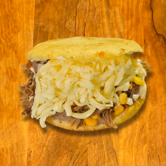 Arepa rellena de carne desmechada, queso y maizitos