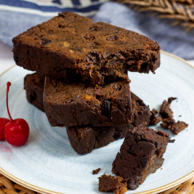 Tradicional y deliciosa torta negra con un toque especial de frutos secos, pasas, nueces, brevas, banana y almibar.