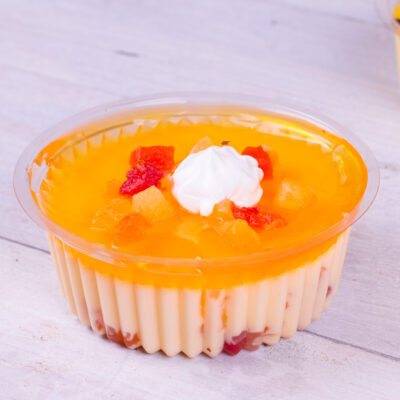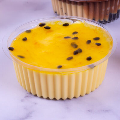 Suave y dulce torta de vainilla, remojada en tres leches con un especial rellena de maracuyá y crocante base de galleta, decorado con un suave dulce de maracuyá.