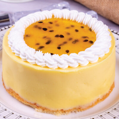 Suave y dulce torta de vainilla remojada en tres leches con un especial relleno de maracuyá. Y crocante base de galleta, decorado con un suave dulce de maracuyá.