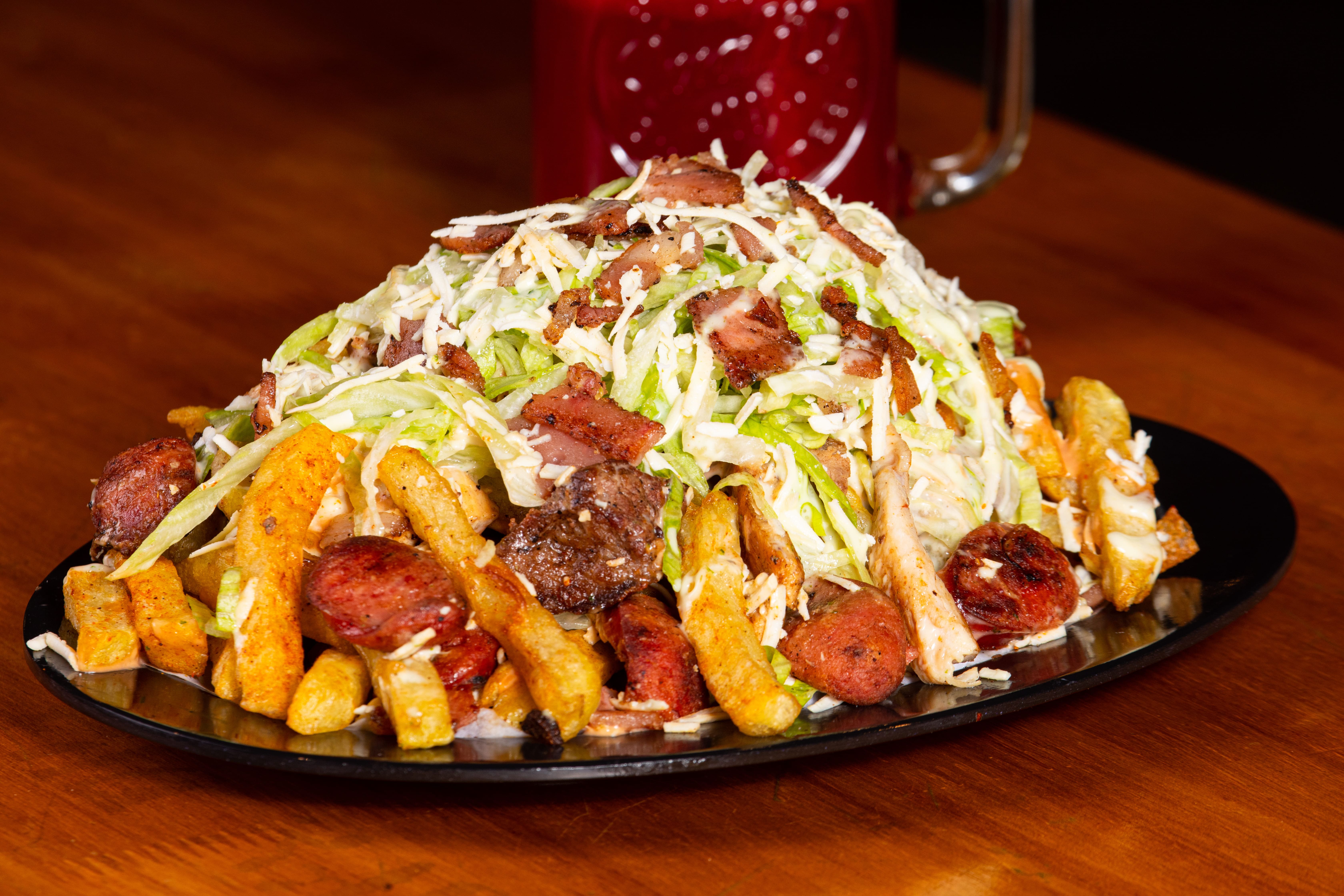 Carne, pechuga de pollo, chorizo premium ahumado, papa chip, papa francesa, salchicha de pollo, tocineta, lechuga, queso costeño, salsas de la casa.