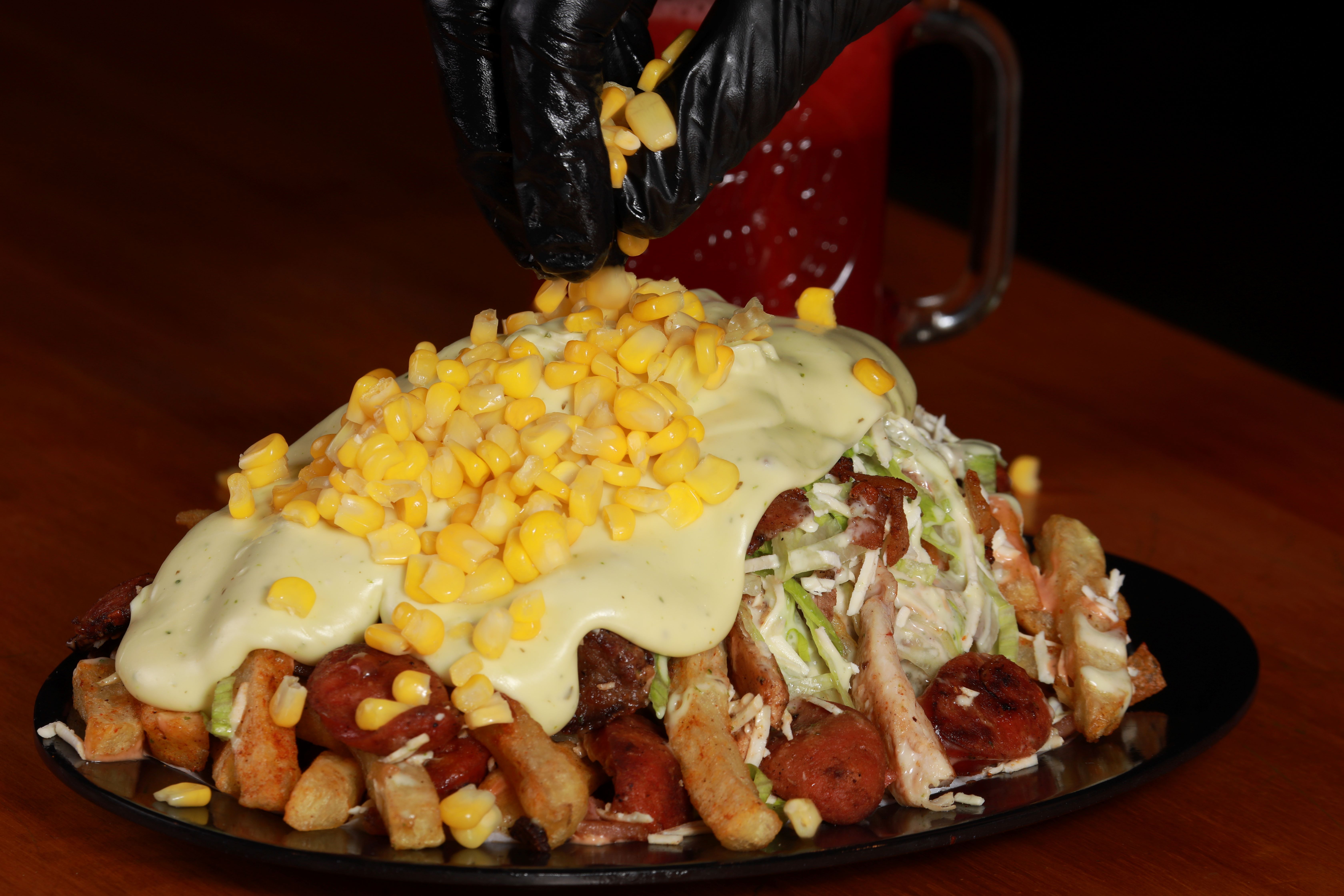 Carne, pechuga de pollo, chorizo premium ahumado, papa chip, papa francesa, maíz tierno, queso gratinado, salchicha de pollo, tocineta, lechuga, queso costeño, salsas de la casa.