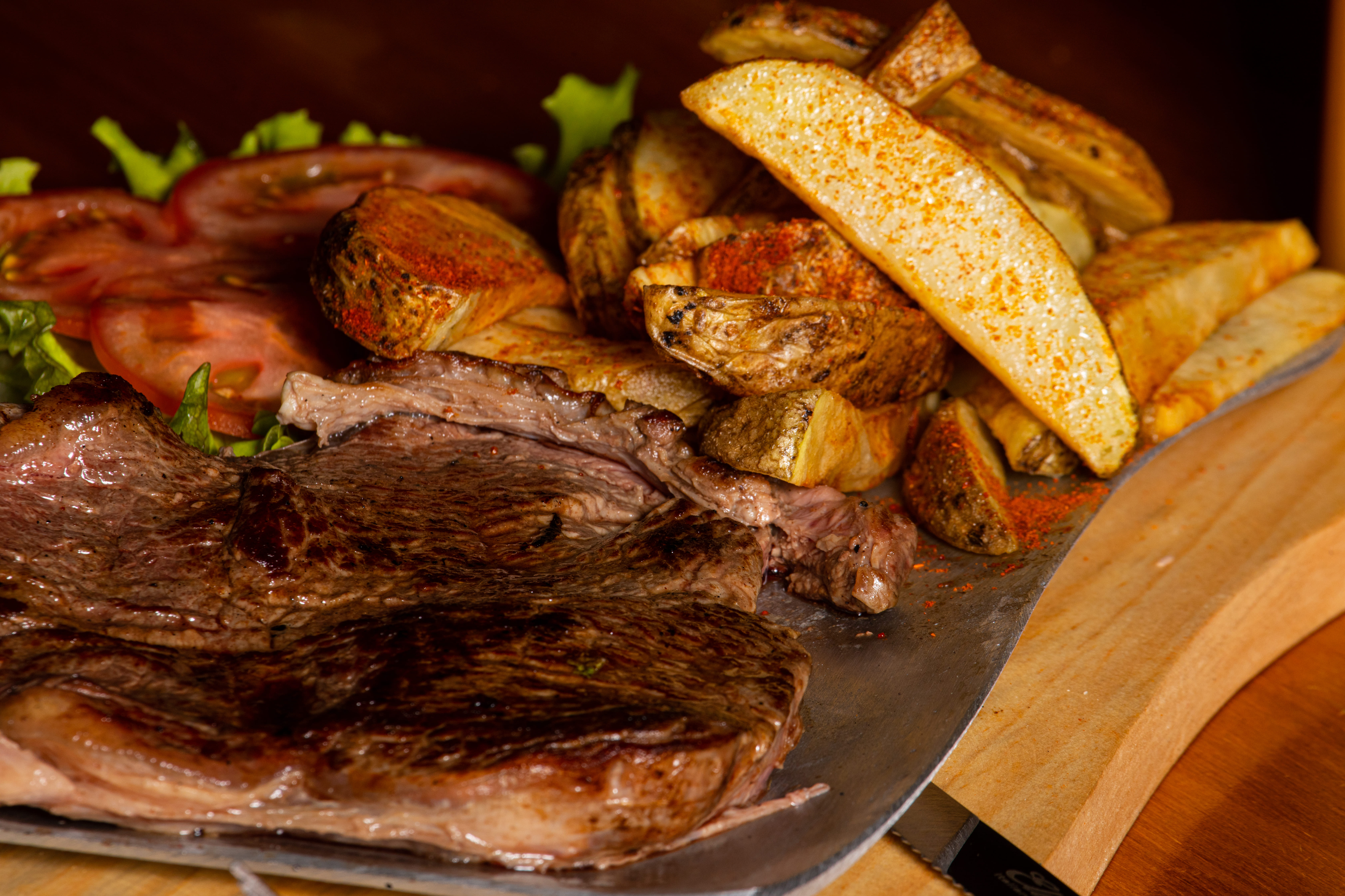 Dos porciones de carne de 150 g de res, queso tajado, tocineta, vegetales, papa a la francesa.