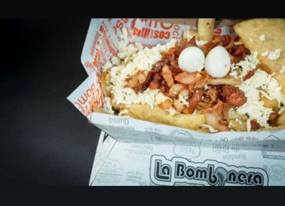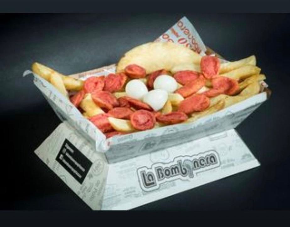 1 Bombon de pollo + 1 torta de carne + 1/2 arepa + porción pequeña de papitas artesanales + salsas al gusto