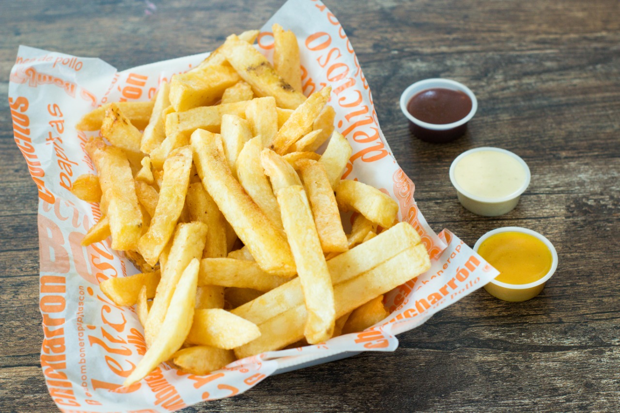 2 bombones de pollo + 2 tortas de carne + 1/2 arepa + porción grande de papitas artesanales + salsa al gusto