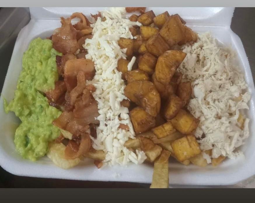 Tocineta + pollo + 1 madurito en trocitos + guacamole artesanal + queso rayado + porción grande de papitas artesanales + salsas al gusto