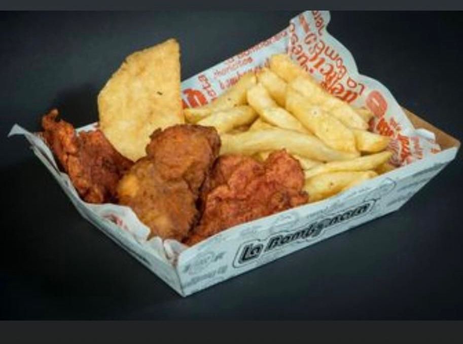 1 bombón de pollo + 2 tortas de carne + 1/2 arepa + porcion grande de papitas artesanales + salsas al gusto