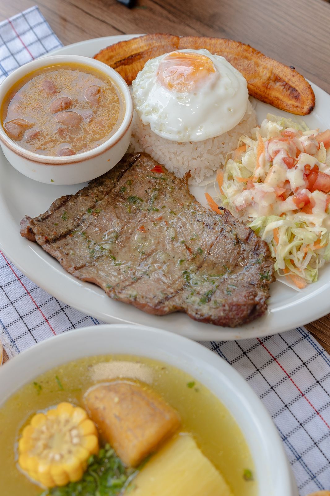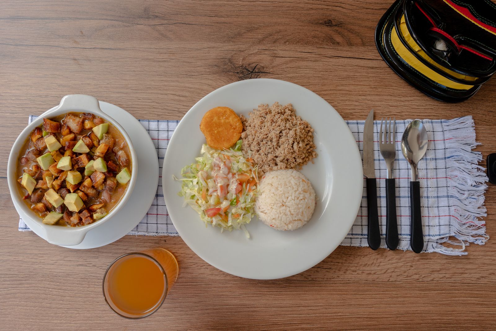 Acompañado con carne de res, cerdo o chicharrón, ensalada de la casa y papas fritas.