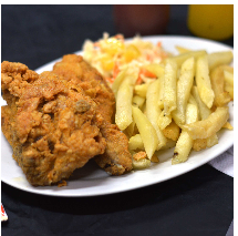 Incluye contramuslo ensalada de la casa y papas fritas.