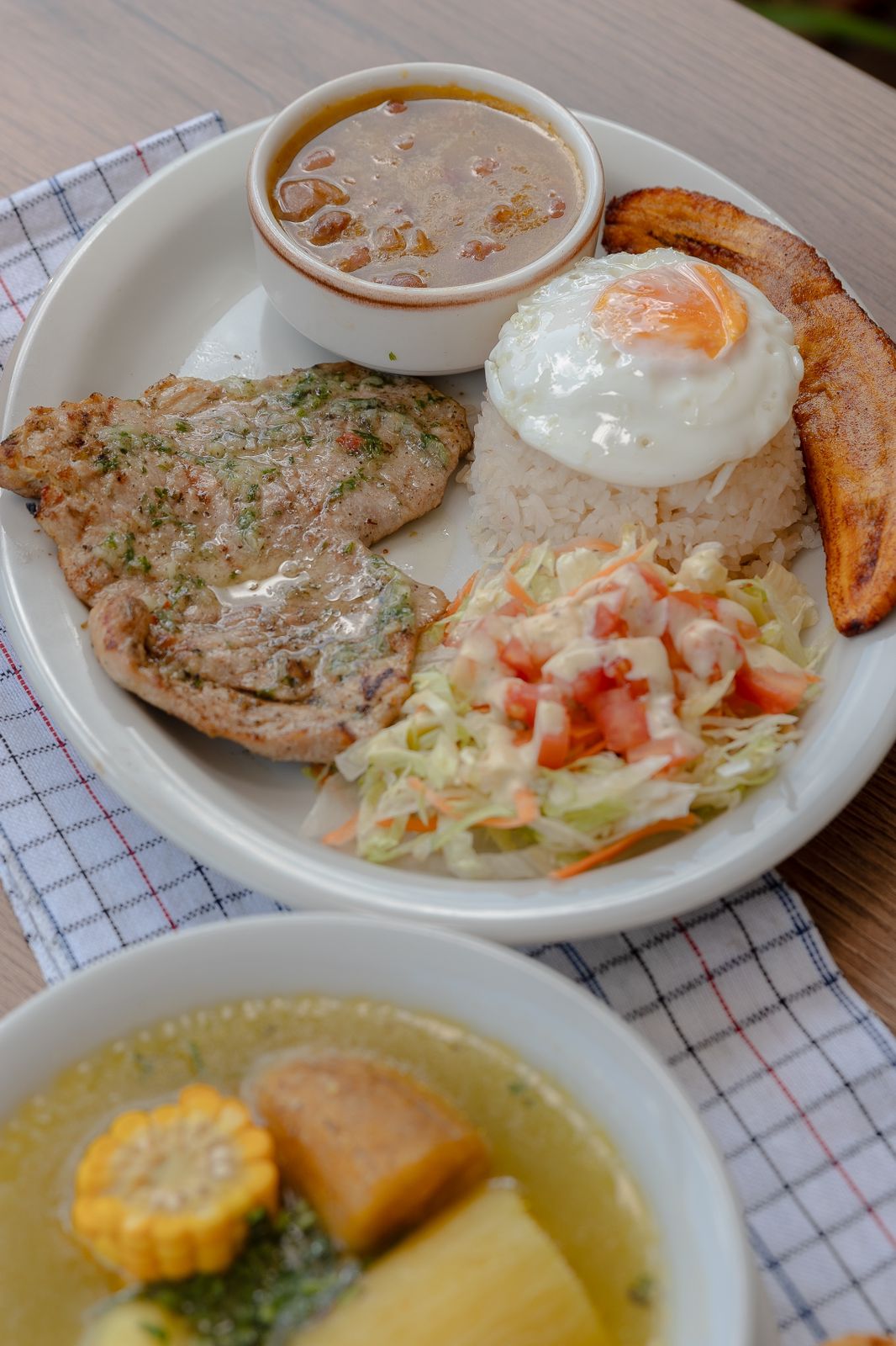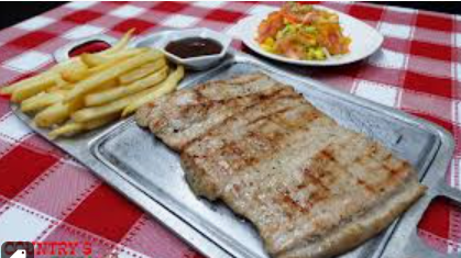 Lomo de cerdo de 300 gramos papas fritas, ensalada de la casa, arroz y huevo.