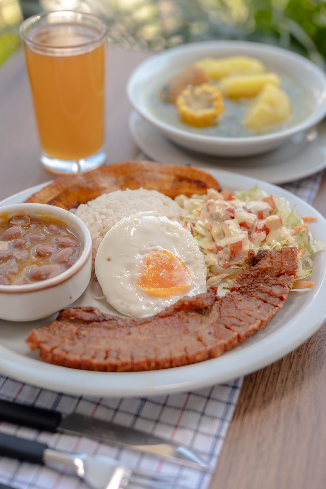 Bandeja con carne de cerdo, res o chicharrón, frijoles, arroz ensalada de la casa y maduro.