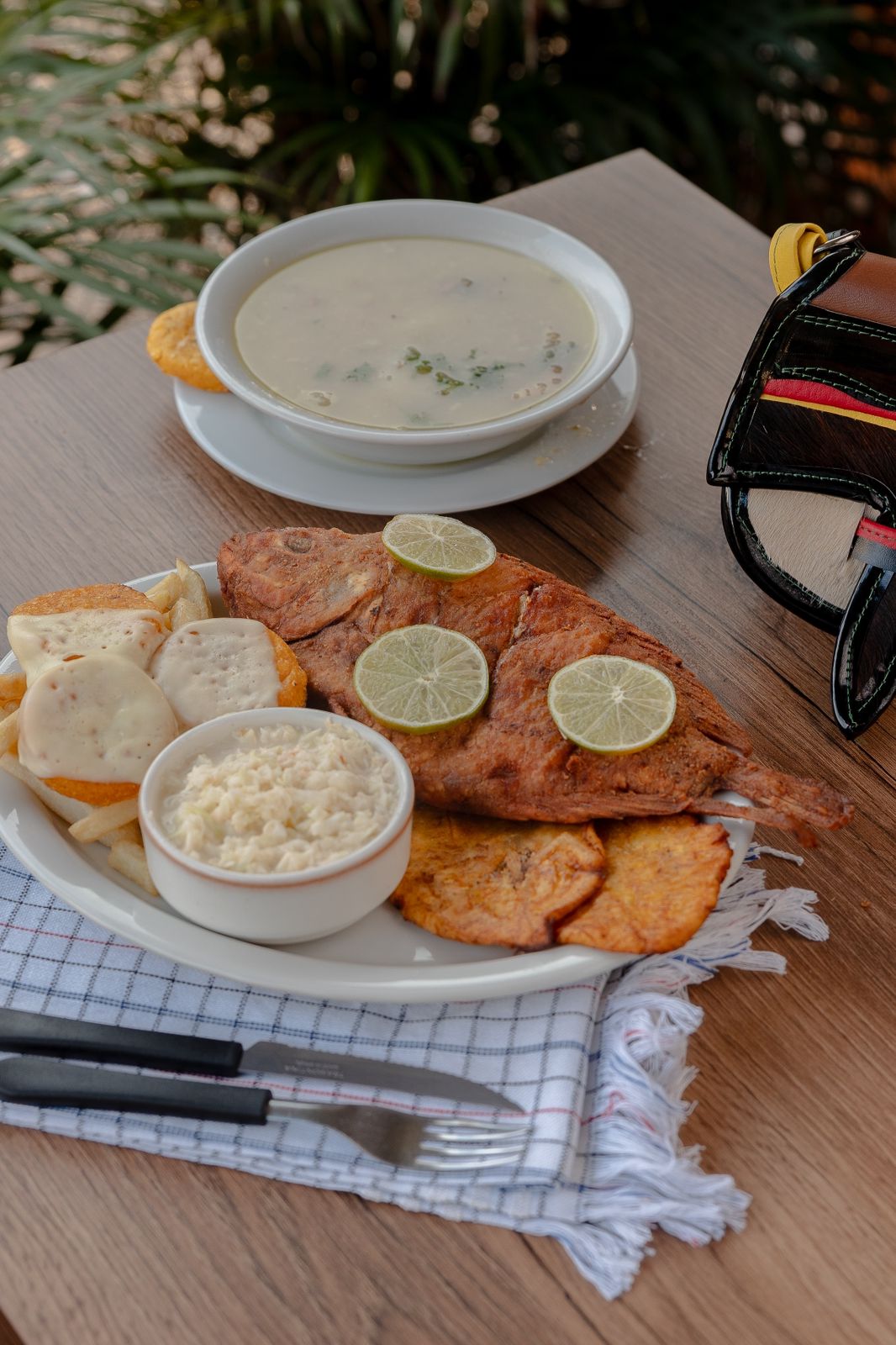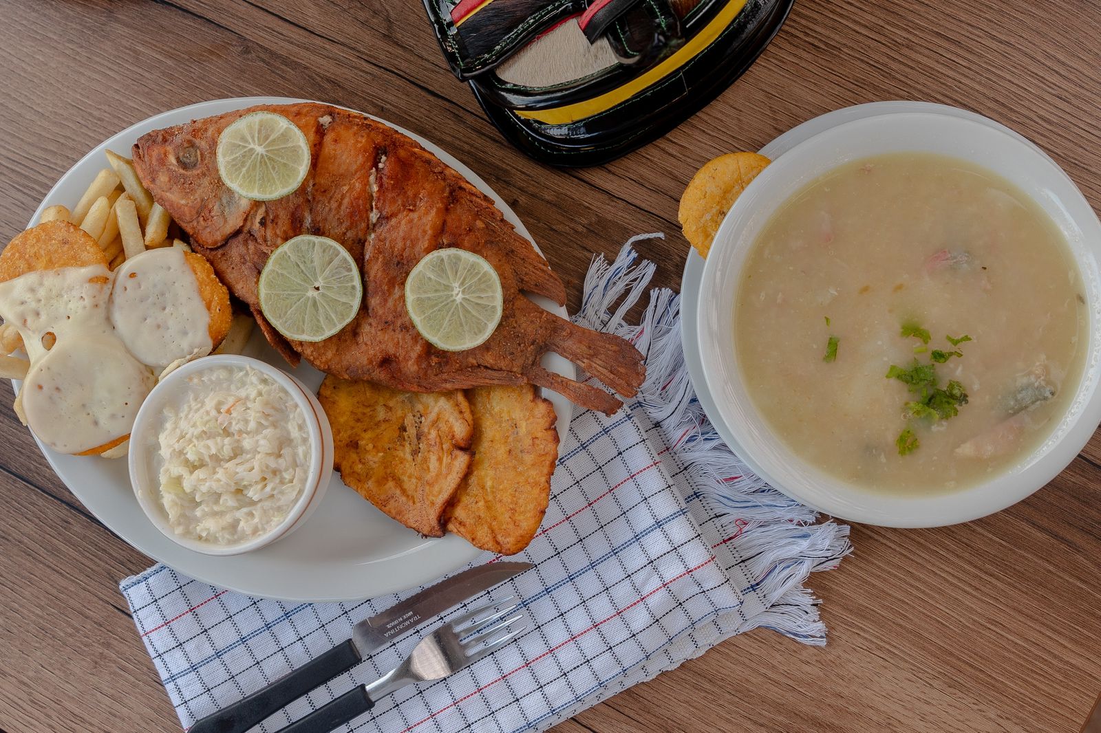 Trucha frita con guarniciones, ensalada de la casa y patacon.
