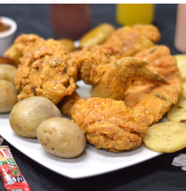 Pollo apanado entero 8 presas, 4 papas cocidas y 4 arepas.