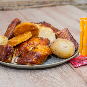 Medio pollo asado al carbón, 4 presas, 2 arepas y 2 papas cocidas.