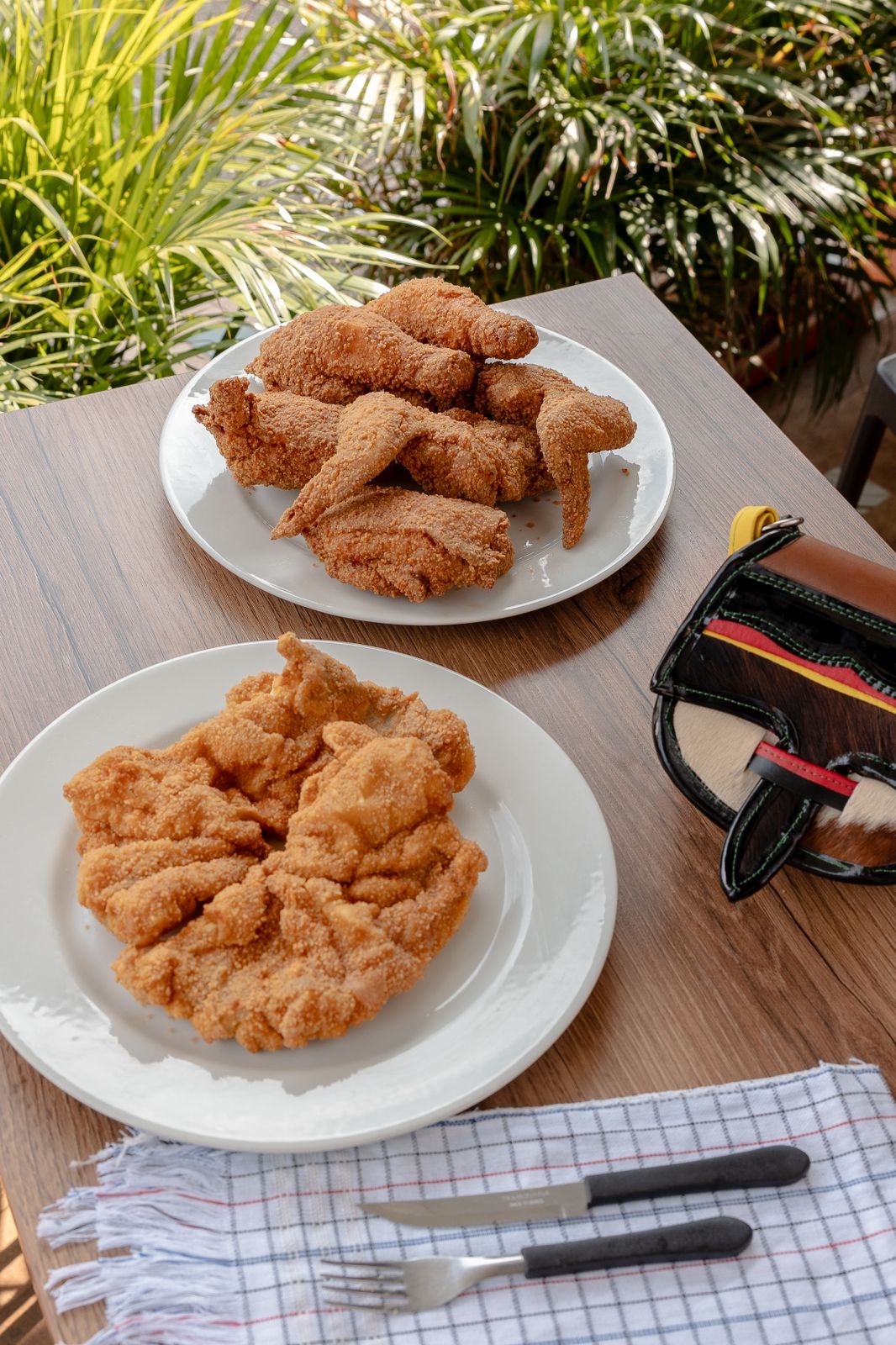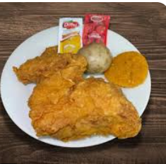 Cuarto de pollo apanado 2 presas, 1 arepa y 1 papa cocida.