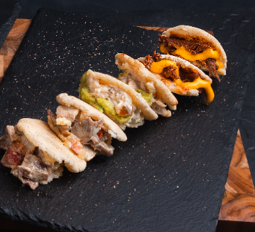 Arepitas de harina de maíz rellenas con carne, pollo, pernil y queso amarillo.