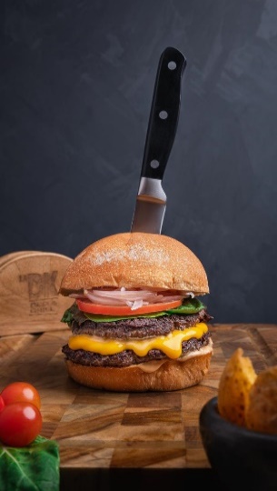 Hamburguesa con: doble carne de res, queso, cebolla, tomate, lechuga y salsa.