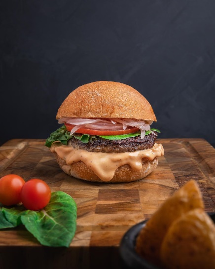 Hamburguesa clásica con carne de res, cebolla, tomate, lechuga y salsa.