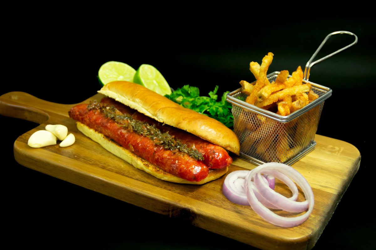 Pan brioche, salsa de la casa, mostaza americana, chorizo argentino, queso Mozarella y un delicioso chimichurri ahumado acompañado de nuestras deliciosas papas a la francesa