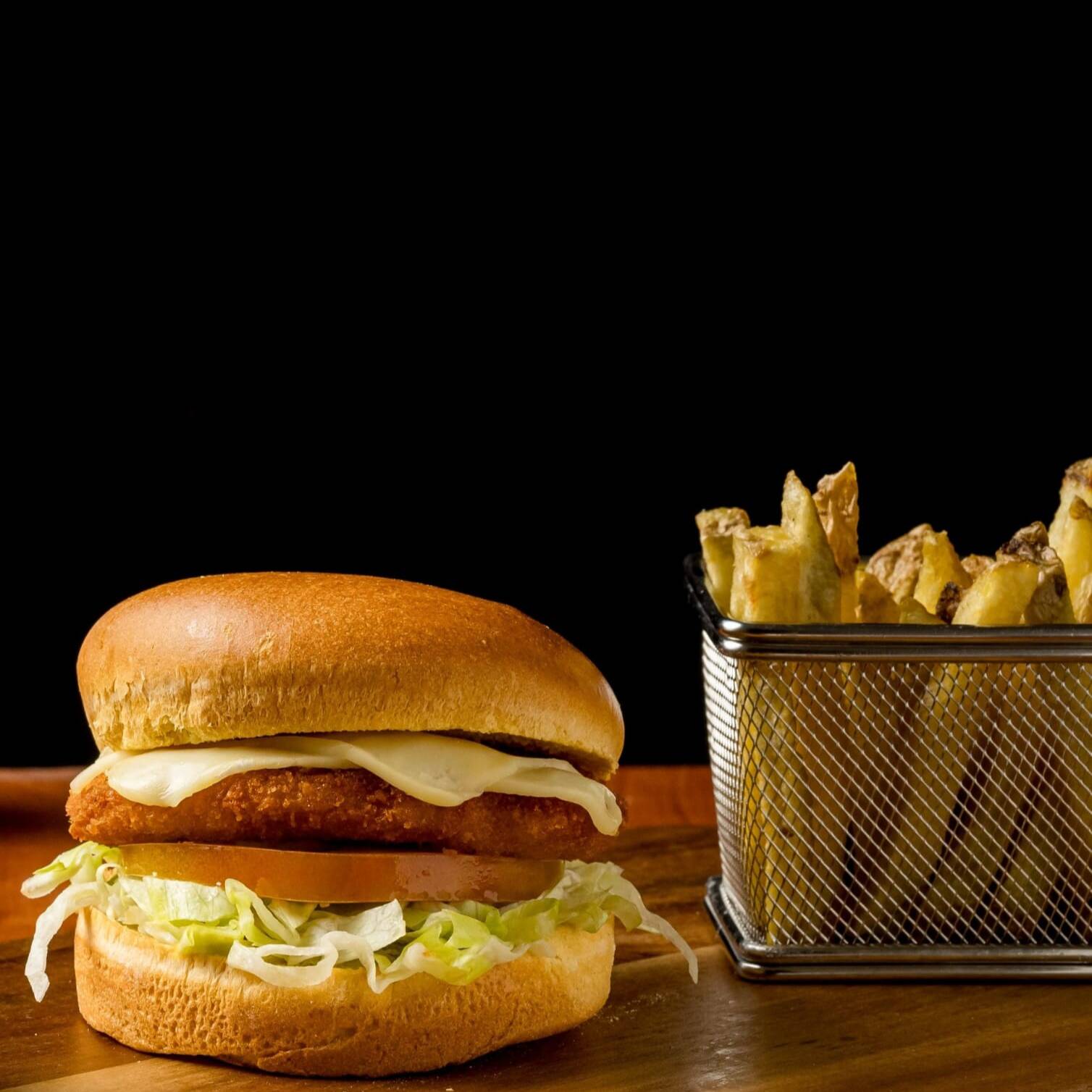 Pan brioche, pollo apanado, queso mozzarella, lechuga, tomate, salsa sweet BBQ y salsa alioli.