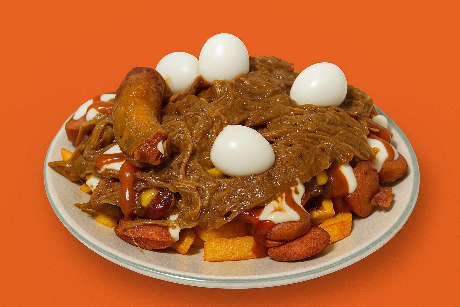 Papas a la francesa, salchicha tradicional, carne desmechada, queso mozzarela, 1 huevo de codorniz y salsas.