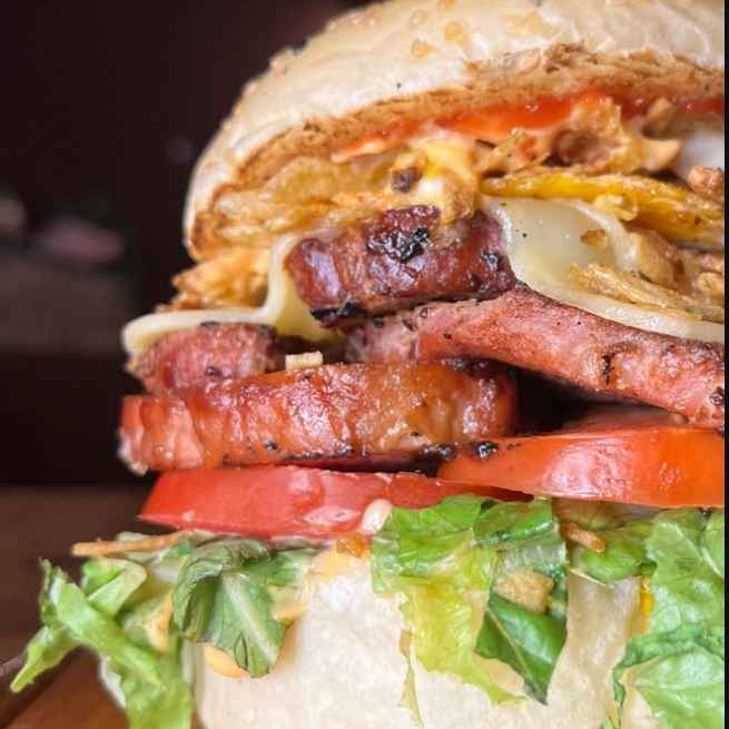 Pan hamburguesa, 100 gramos de CHULETA AHUMADA, lechuga, tomate, queso mozzarella, jamón, tocineta y salsas de la casa.