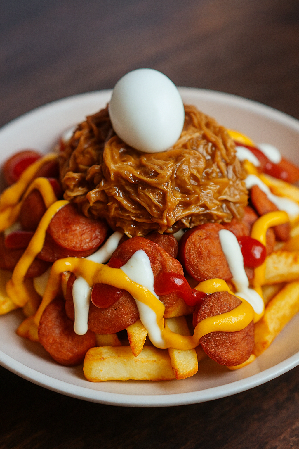 Papas a la francesa, salchicha tradicional, carne desmechada, queso mozzarela, 1 huevo de codorniz y salsas.