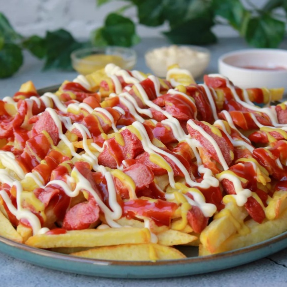 Papas a la francesa 250 g, salchicha tradicional, queso mozzarella, 1 huevo de codorniz y salsas.