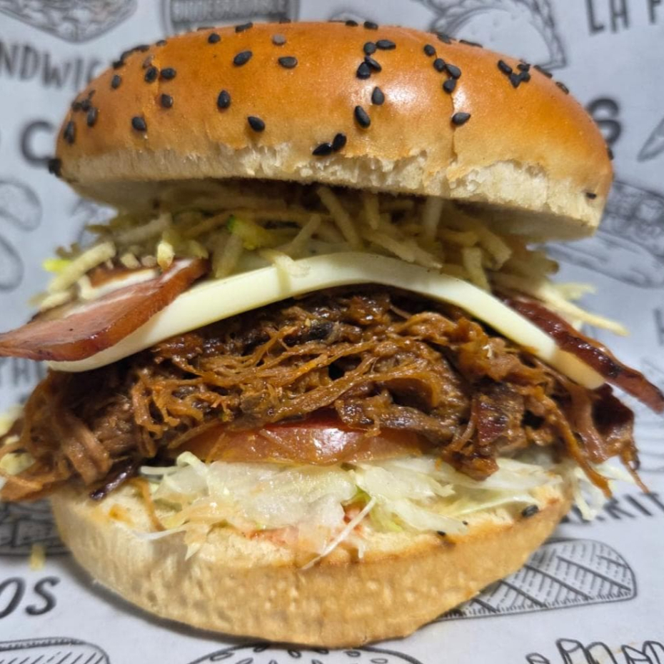 Pan hamburguesa, 120 gramos de Carne DESMECHADA, lechuga, tomate, queso mozzarella, jamón, tocineta y salsas (tomate, De la Casa, BBQ, rosada).