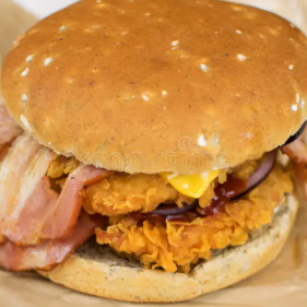Pan hamburguesa, 100 gramos de pechuga de pollo apanado, lechuga, tomate, queso mozzarella, jamón, tocineta y salsas de la casa.