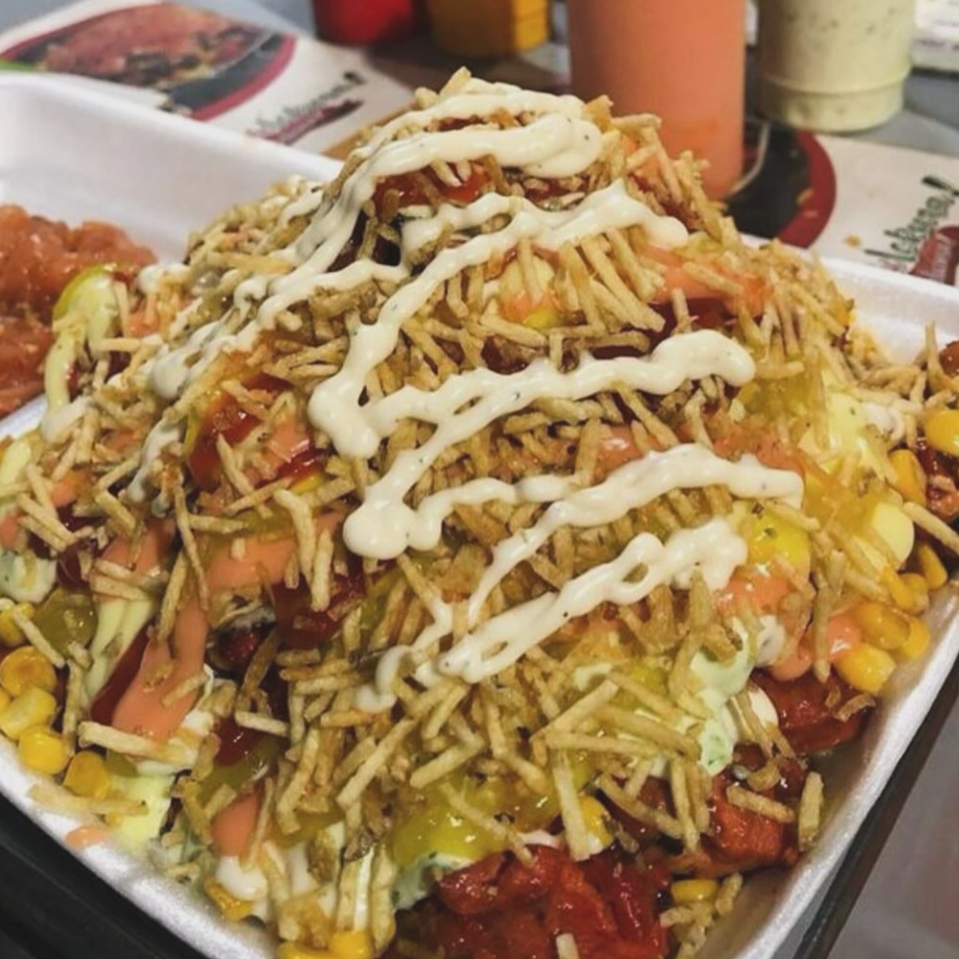 Papas a la francesa 300 g, salchicha tradicional, salchicha ranchera, queso mozzarella, tocineta, 2 huevos de codorniz, maíz tierno, madurito, ripio y salsas.