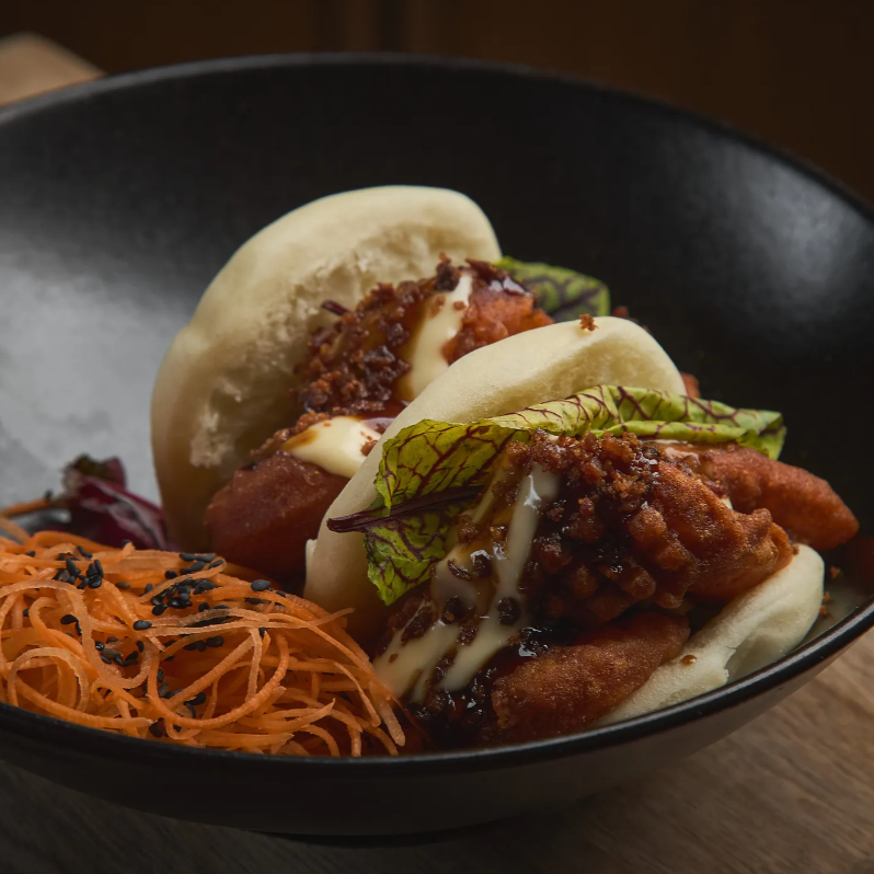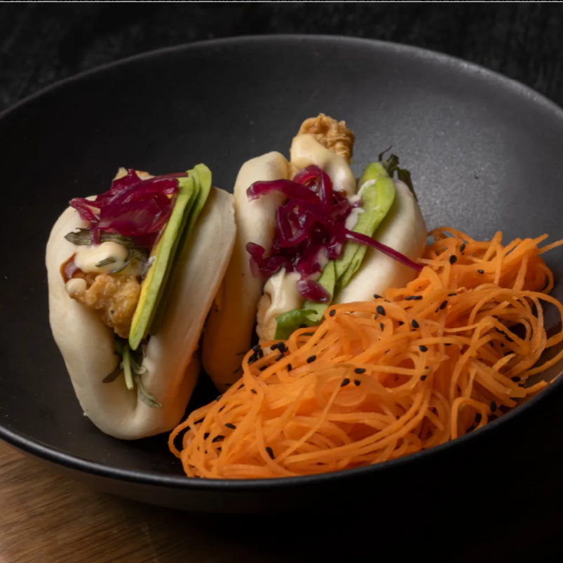 Panecillos al vapor relleno de pollo tempura, aguacate, chutney de repollo morado acompañado de salsa spicy.