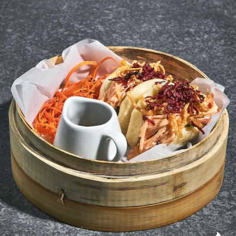 Panecillo al vapor relleno de panceta de cerdo en cocción lenta, en salsa oriental de ostras y panela, mézclum, queso crema al coco, maní tostado y cebollín.