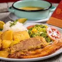 Frijoles, Carne Frita o Sudada, Chicharrón, Chorizo, Tajada de Maduro. Acompañamientos: Arroz, Ensalada, Guarapo o Claro.