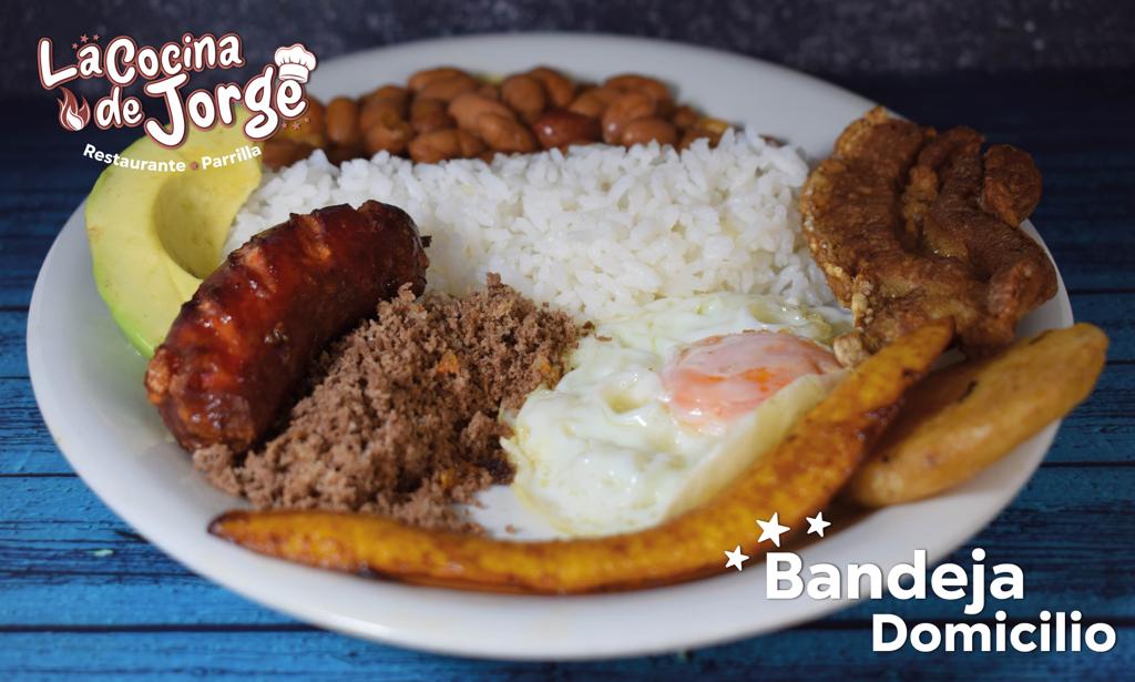 Bandeja Paisa*1 + Jugo del día o Mazamorra*1 // Arroz, tajadas, aguacate, arepa, ensalada, 50gm molida, 100gm de chicharron, chorizo