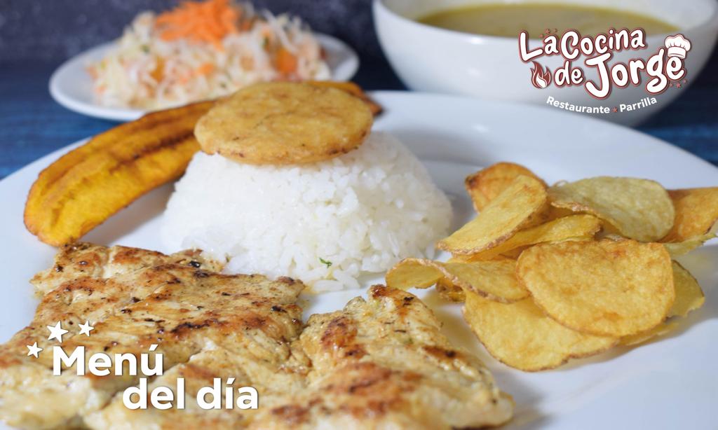Proteína a elección, arroz, ensalada, sopa del día de 12 oz o fríjoles. Plato personal