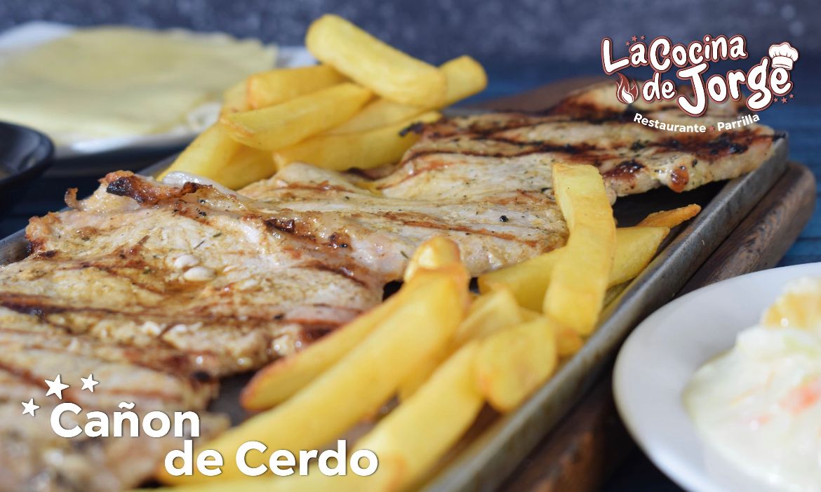 200 gr de cañón de cerdo, cerdo, salsa de la casa, papa cocida y ensalada.