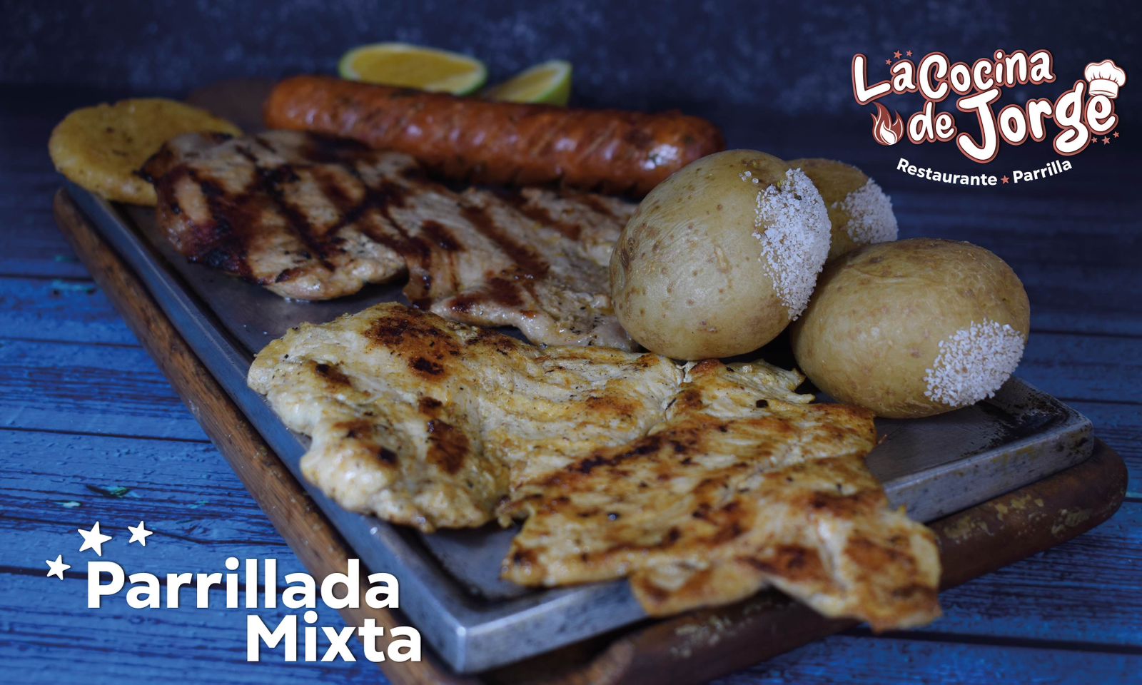 Parrillada con cañón de cerdo, pechuga a la plancha y chorizo cerdo.