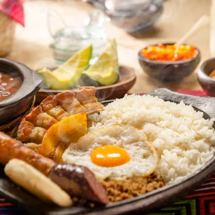 El clásico: Frijoles, arroz, carne molida, chicharrón, chorizo, huevo frito, tajada de maduro, arepa y aguacate.