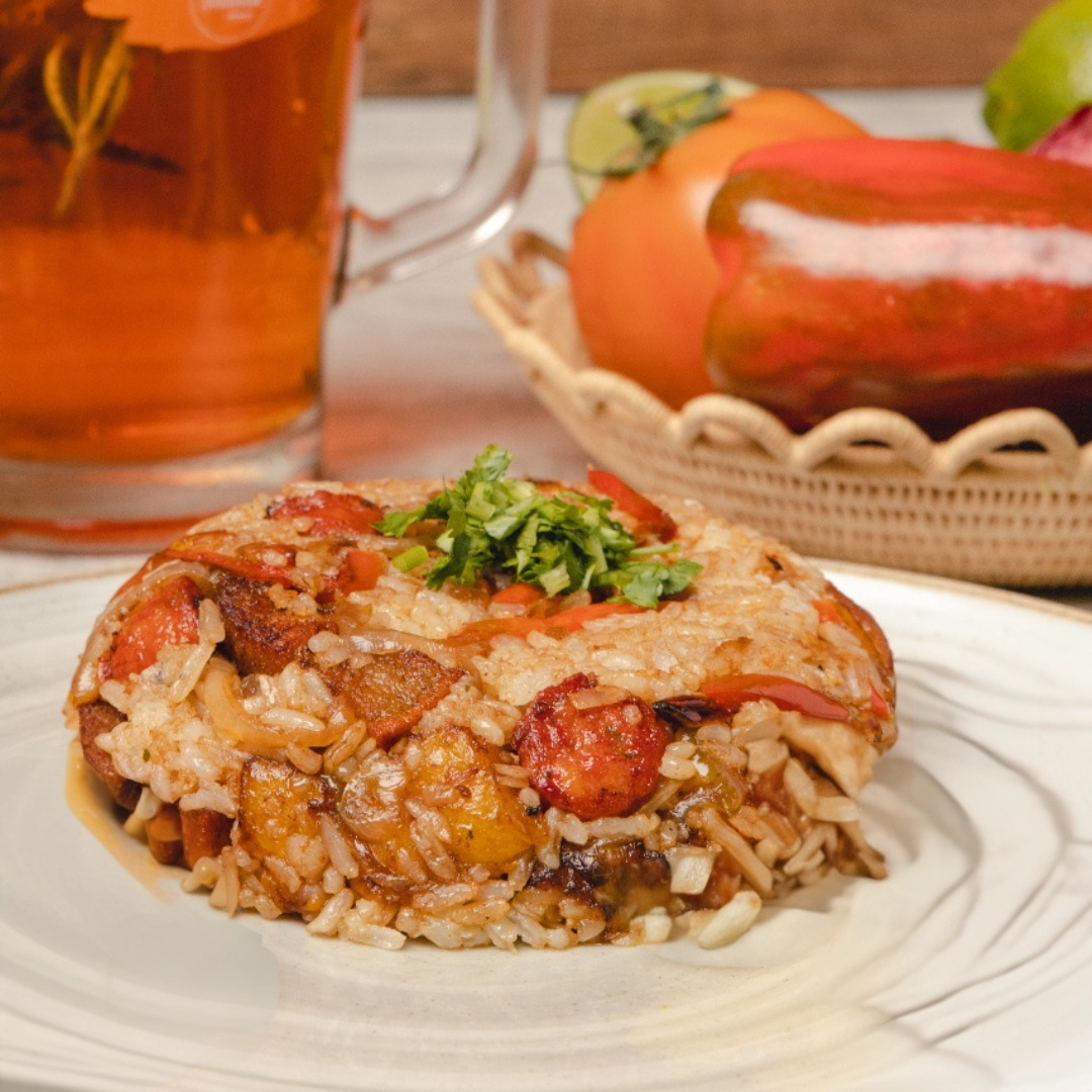 El sabor de casa en un solo plato. Frijoles bien cargaditos con arroz blanco, chicharrón crocante, madurito dulce,y el toque especial de hogao casero… como los de mamá. Disponible para 1 o 2 personas.