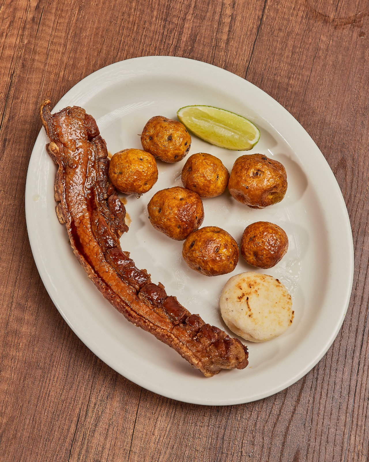 Chicharrón crocante y jugoso con arepas. Sencillo, casero y delicioso.