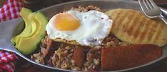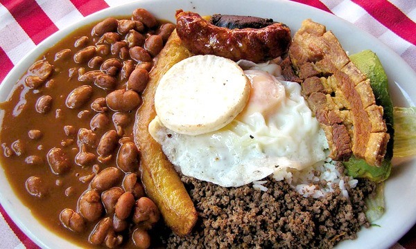 Incluye arroz, frijoles, maduro, aguacate, ensalada, arepa, carne molida, chicharrón, y carne de cerdo.