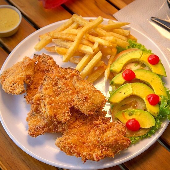 Pechuga de pollo apanada más papas a la francesa y ensalada de la casa.