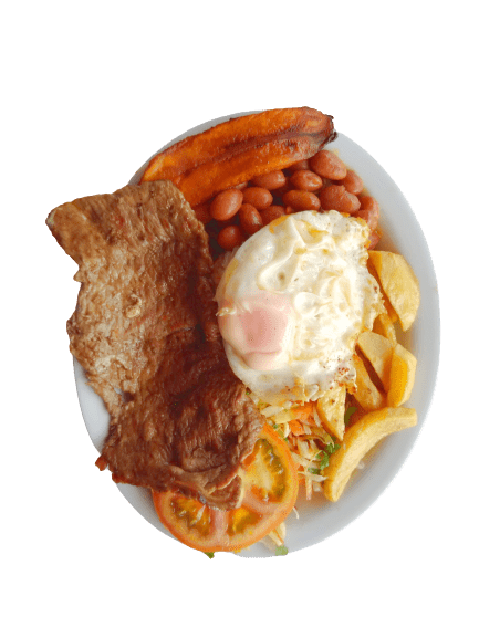 Bandeja con arroz, carne a elegir, ensalada, huevo frito, tajada de maduro o papas a la francesa, sopa y bebida.
