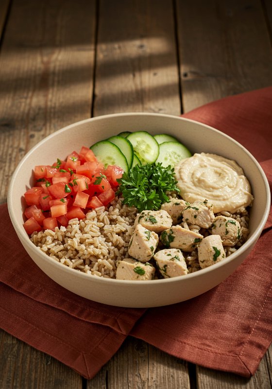 Bowl a base de arroz integral con pollo en cubos, pepino cohombro, tomate, hummus de garbanzos y un toque de perejil.