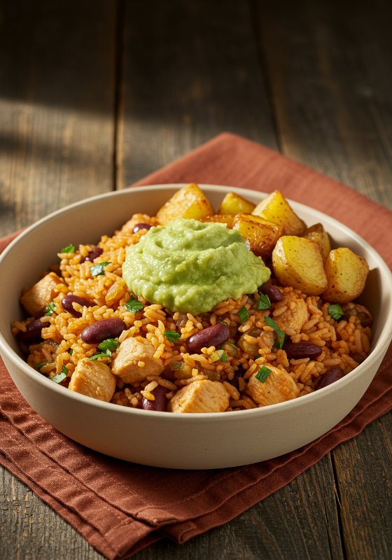 Bowl a base de arroz achiotado con pollo en cubos, guacamole, papa, madurito y un toque de cilantro.
