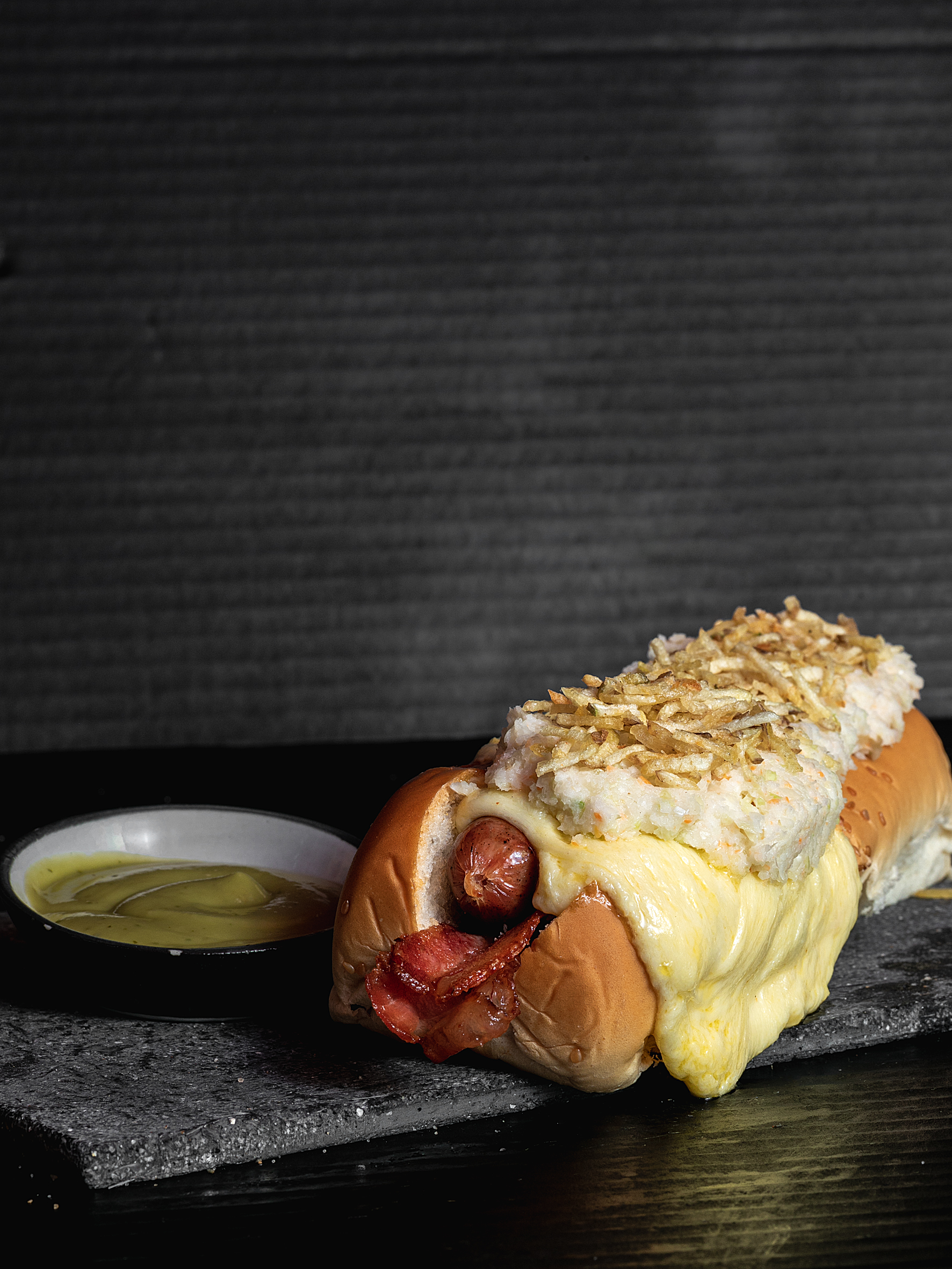 Perro Especial con Extra Tocineta – Pan grande con queso fundido, extra de tocineta crocante, ensalada fresca de la casa y crujiente ripio de papa. Acompañado con salsas al gusto.